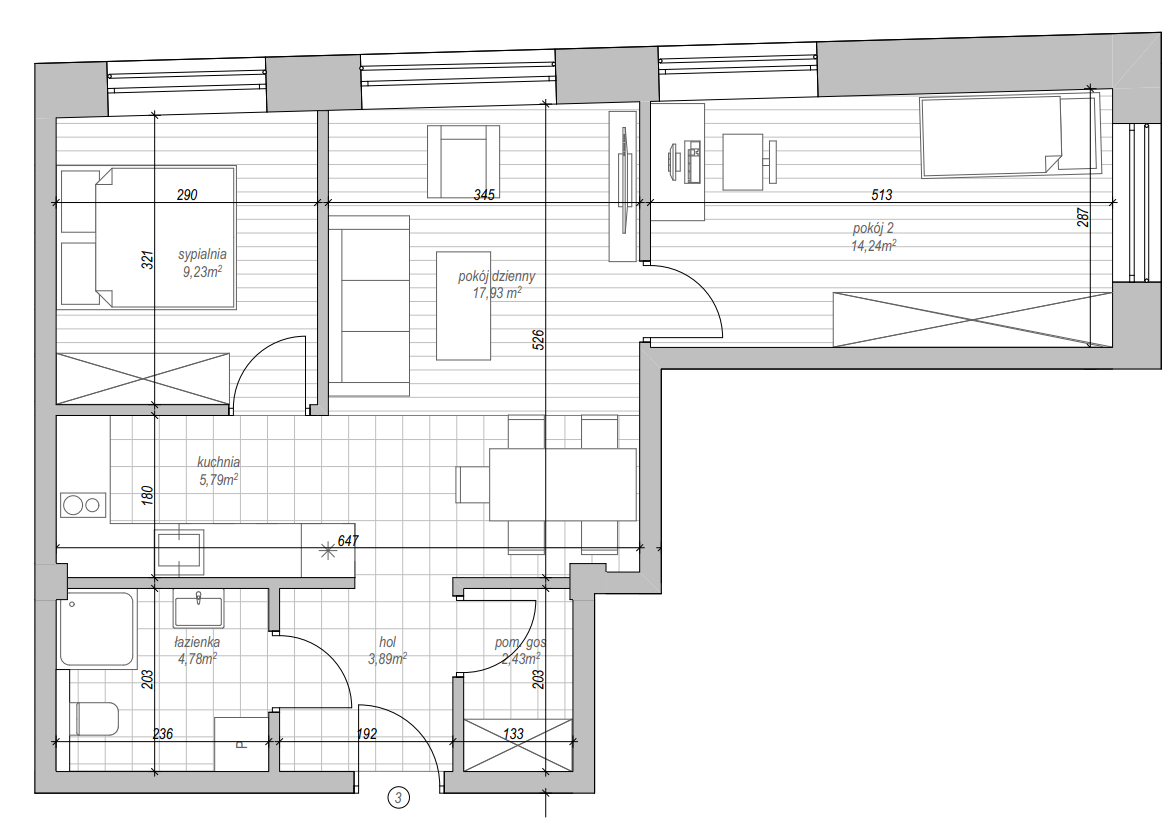 Mieszkanie o powierzchni 58,3 m2. Jest to przestrzeń perfekcyjnie skrojona dla osób poszukujących przestronnego mieszkania w centrum miasta. Dwa pokoje dzienne, sypialnia, pomieszczenie gospodarcze, hol, łazienka i kuchnia – gwarantują pole do popisu dla rodzin, które chcą zamieszkać w doskonałej lokalizacji.