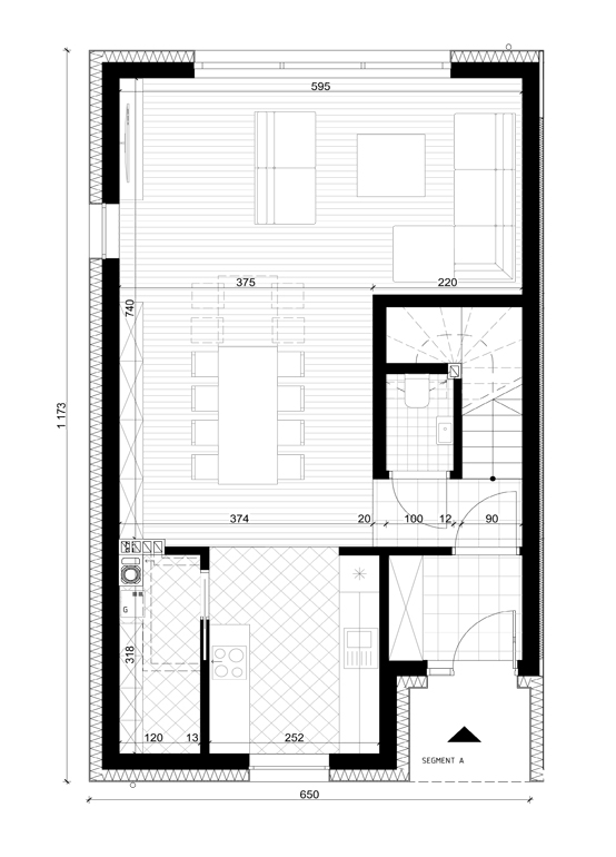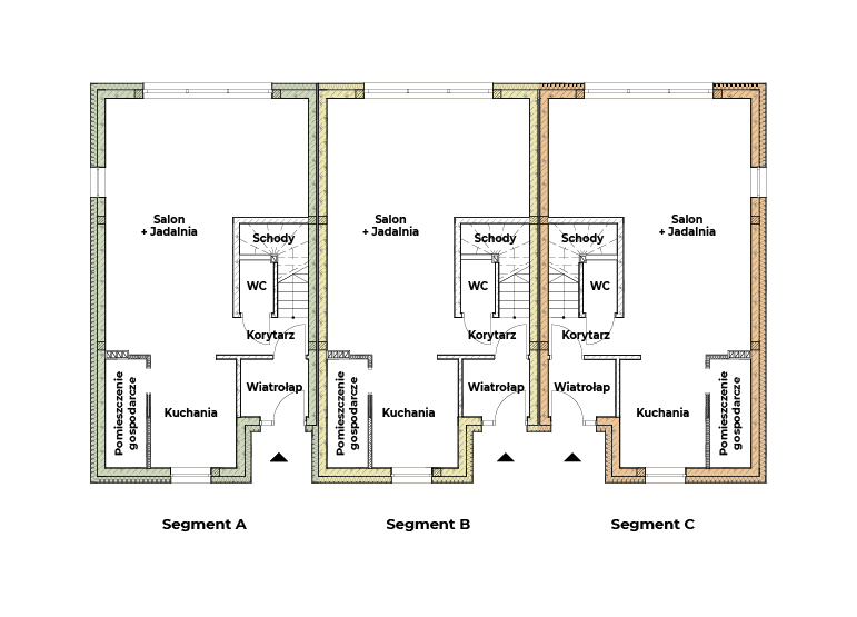 Domy w zabudowie szeregowej charakteryzują się wysoką estetyką i spójnością. Segmenty zorientowane są wschód-zachód, a każdy z nich posiada wydzieloną część dzienną na parterze oraz część nocną na piętrze. Własna zielona strefa za domem zapewnia niezależność i komfortową strefę prywatną.